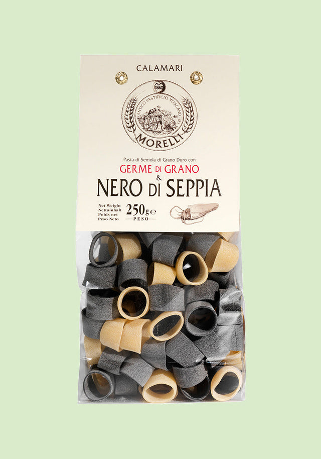 Produced with tuscan durum wheat semolina, processed using artisan methods, bronze drawn and dried at low temperature. This pasta releases an amazing, distinctive fragrance of the Black squid Ink. and wheat germ during cooking Ideal for beautiful platews full of color, they can be served with light simple fish seasonings.